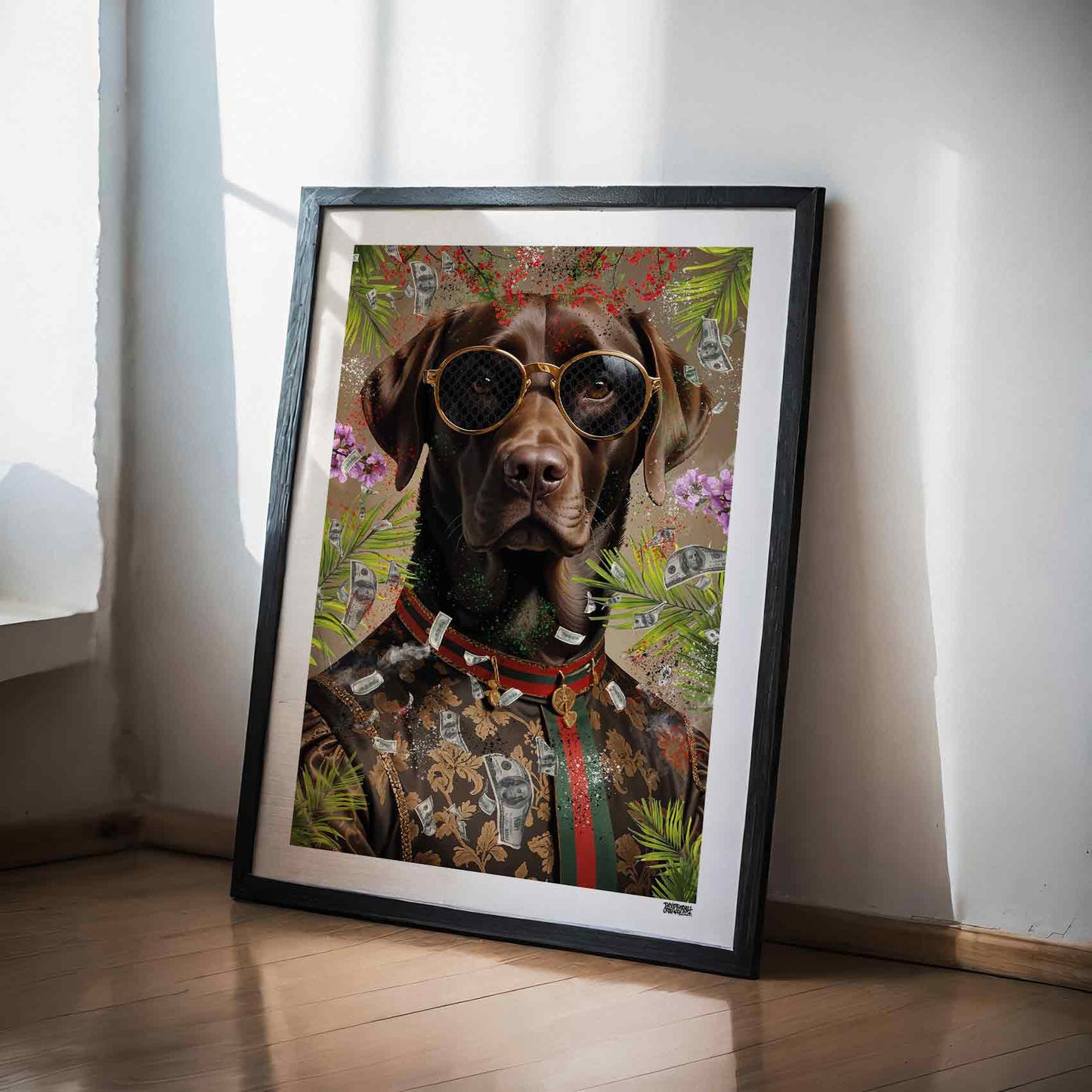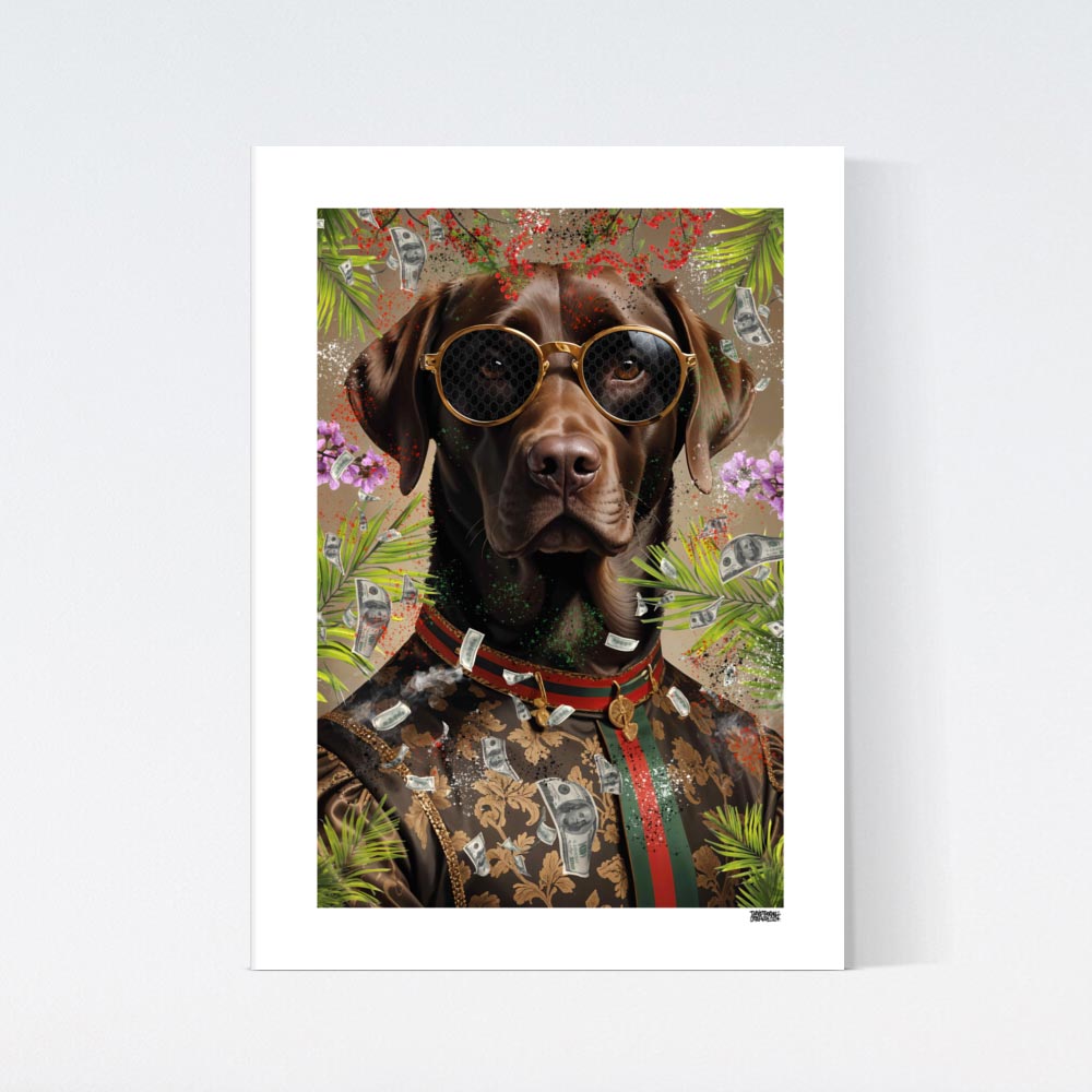 Konstmotiv av en hund som är lik flera raser mot en cool bakgrund. Ge ditt hem en majestätisk touch med denna poster i kunglig bemärkelse. Denna poster blir en imponerande inredningsdetalj i hemmet och ger varje hem en kunglig glans. Postern tillverkas på beställning på högkvalitativt papper och har en vit kant som snyggt ramar in motivet.