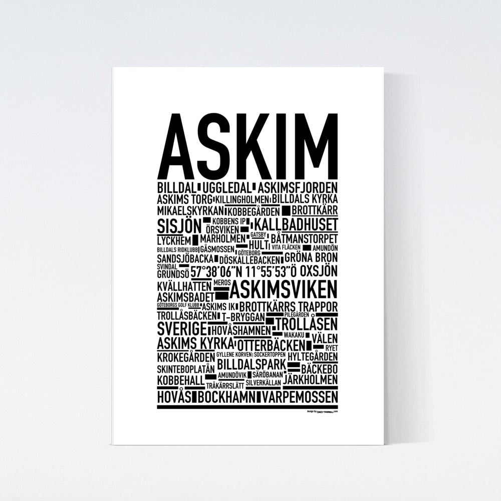 Den ikoniska stadspostern "ASKIM". Med sin eleganta svartvita design fångar den kärleken till Askim och blir en stilren inredningsdetalj som passar perfekt i ditt hem. Postern gör sig lika bra i hallen, vardagsrummet eller sovrummet. Den vita kanten ramar in motivet på ett smakfullt sätt. Varje poster tillverkas på beställning för att säkerställa högsta kvalitet och en exklusiv känsla.