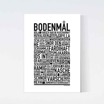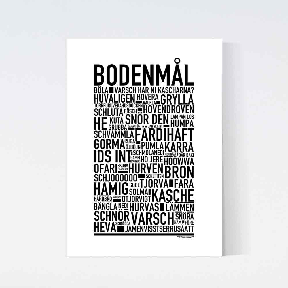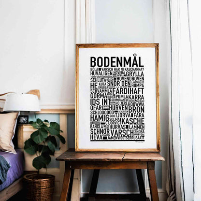 En charmig poster med texten 'BODENMÅL', som firar den unika dialekten från Boden med roliga och karaktäristiska uttryck. Perfekt för att lägga till en personlig och humoristisk touch till ditt hem eller kontor, och för att hylla den lokala dialekten med stolthet och humor. Postern tillverkas på beställning på högkvalitativt papper och har en vit kant som snyggt ramar in motivet.