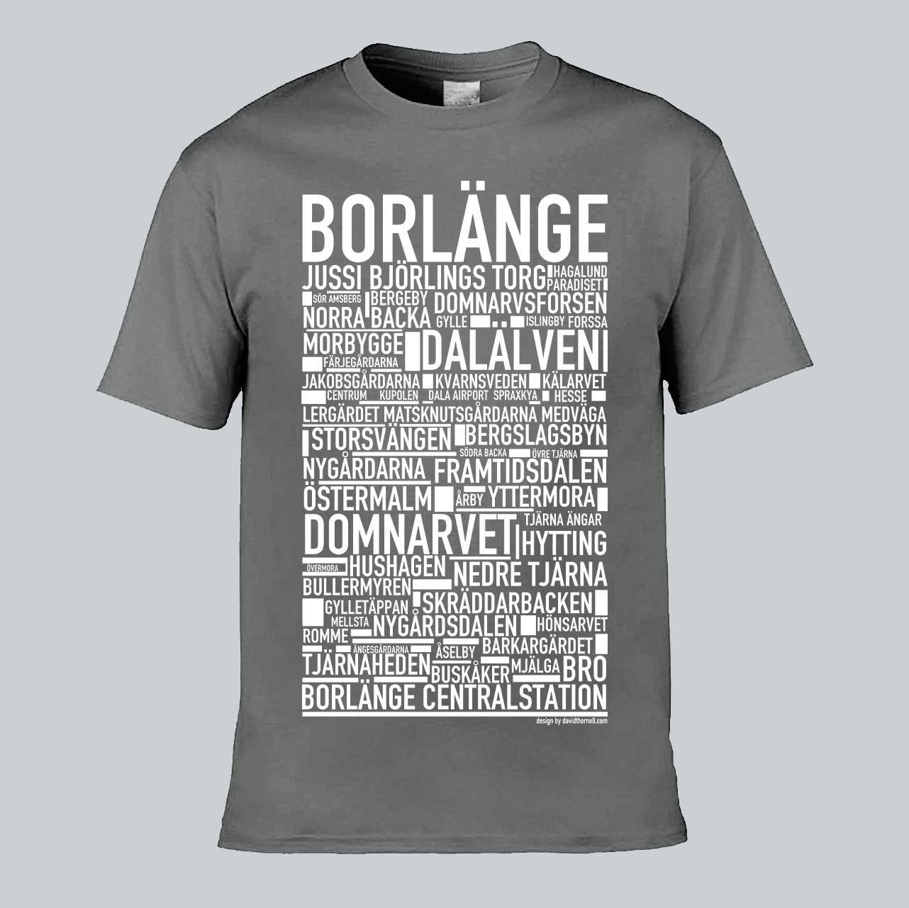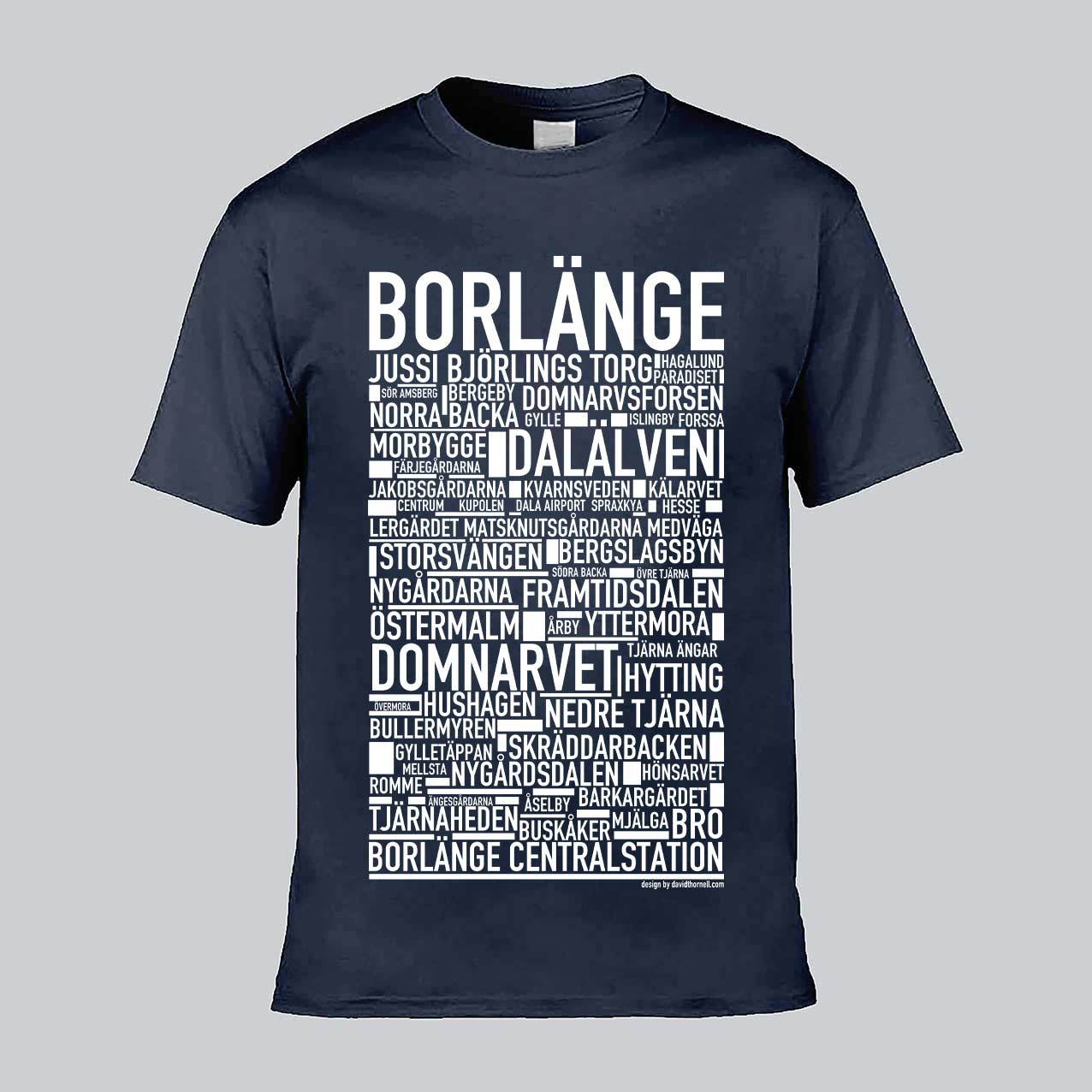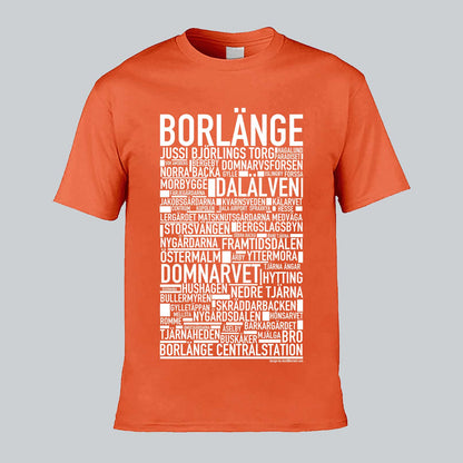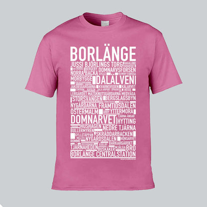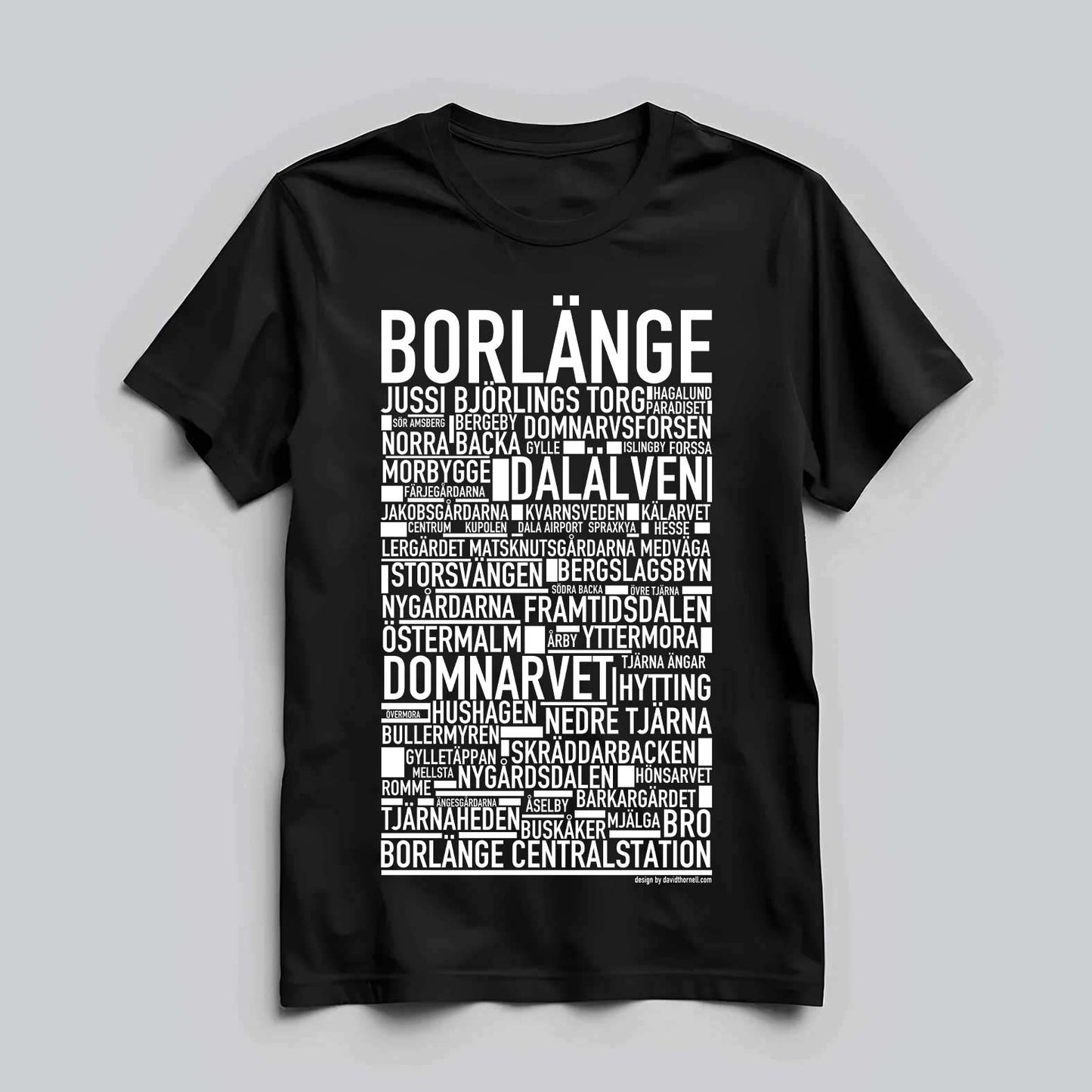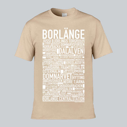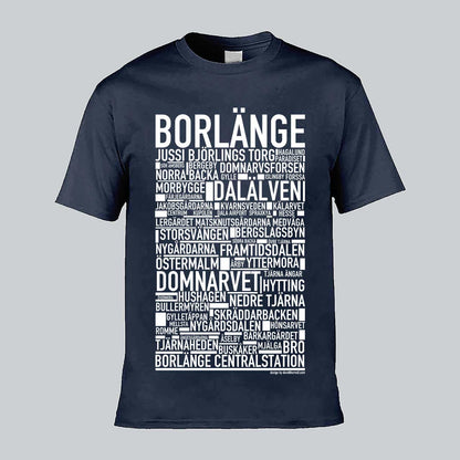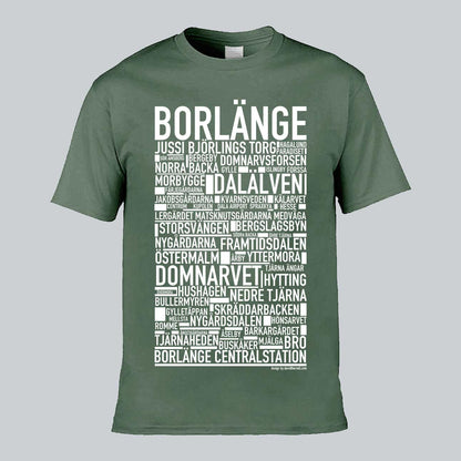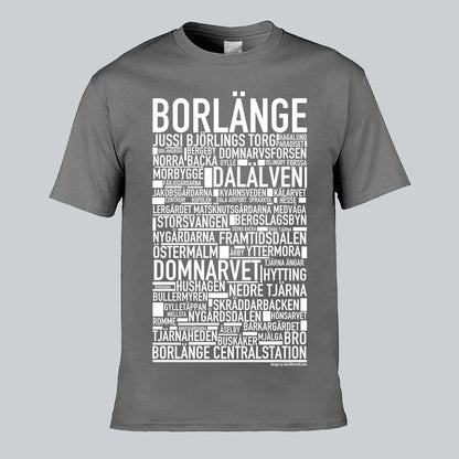 Den ikoniska T-shirten med texten "BORLÄNGE" och namn på platser från denna dalastad med puls, kultur och industrihistoria. Denna stilrena T-shirt ger en unik touch till din garderob och låter dig stolt visa upp din kärlek till Borlänge. Tillverkad i mjuk, högkvalitativ bomull för en behaglig känsla hela dagen.
