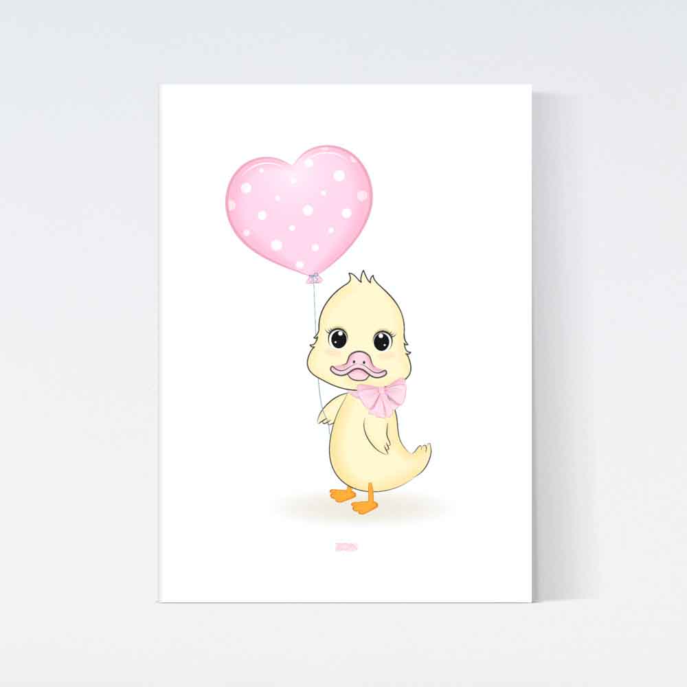En bedårande poster med en söt anka som håller i en rosa ballong. Perfekt att hänga i ett barnrum, kanske ovanför spjälsängen? Postern tillverkas på beställning på högkvalitativt papper och har en vit kant som snyggt ramar in motivet.