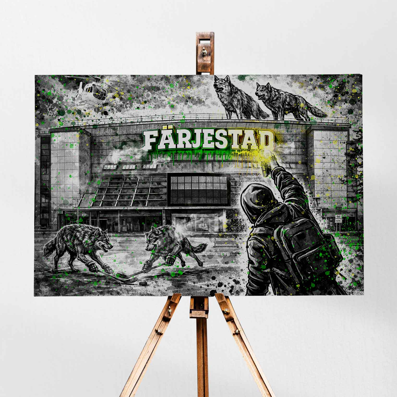 Upplev den ikoniska känslan av ishockey i hjärtat av en stad där sporten lever och andas. Den här canvastavlan fångar energin från arenans ljus, publikens förväntan och den intensiva atmosfären när isen glittrar och varje byte kan avgöra matchen – tolkad i en rå och urban street art-inspirerad estetik som ger motivet extra attityd och karaktär.