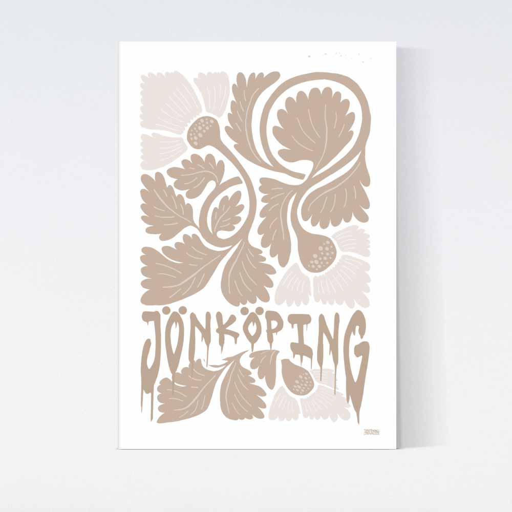 En poster med texten 'JÖNKÖPING' i grafittistil, omgiven av blommor i mjuka beige nyanser. Postern tillverkas på beställning på högkvalitativt papper och har en vit kant som snyggt ramar in motivet.