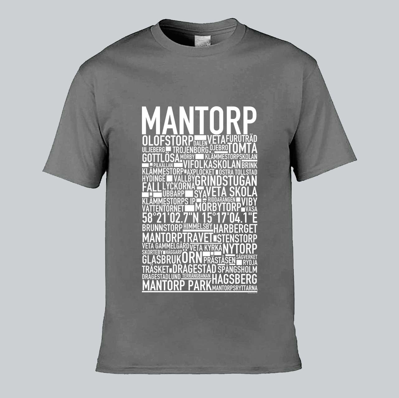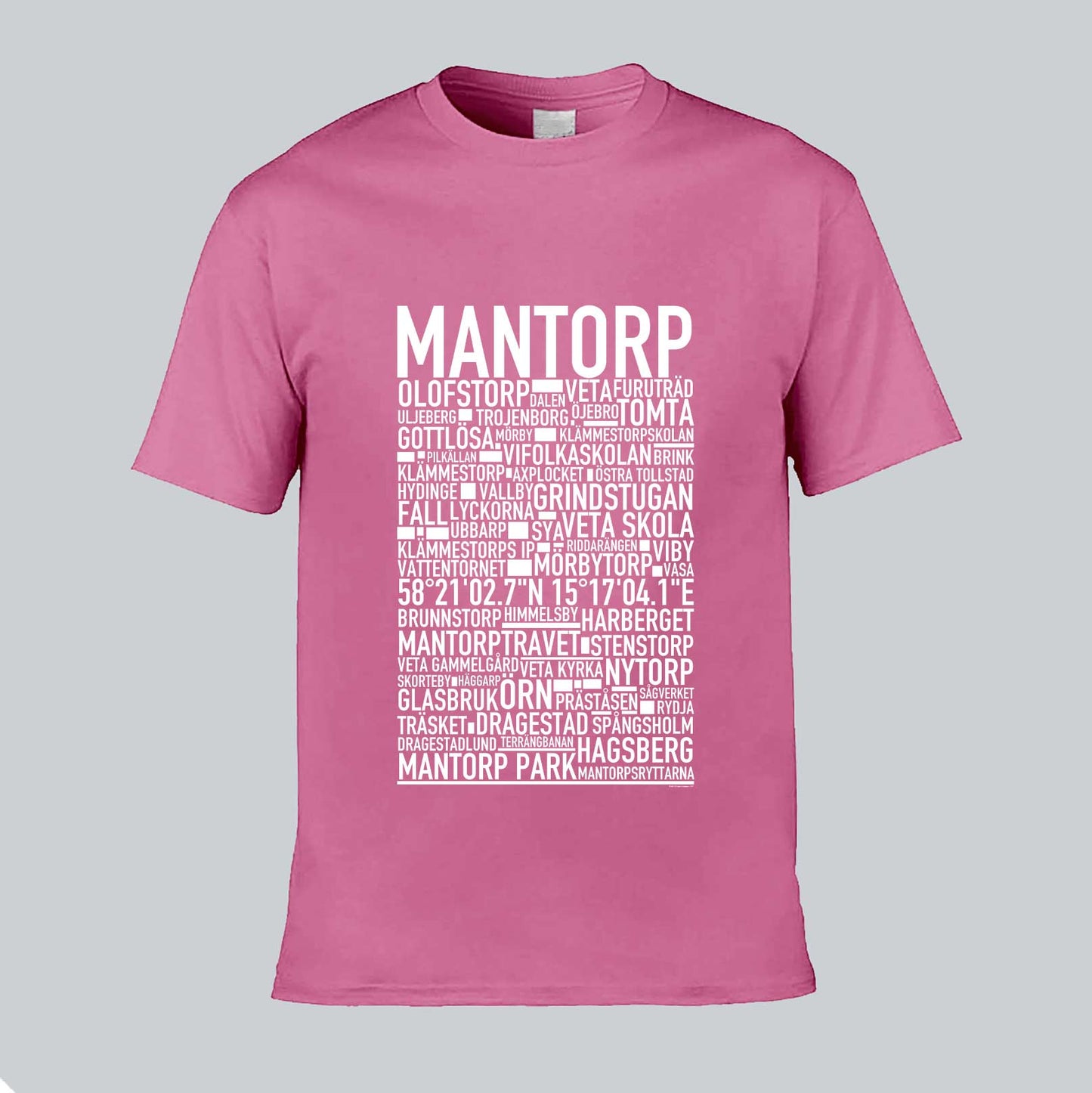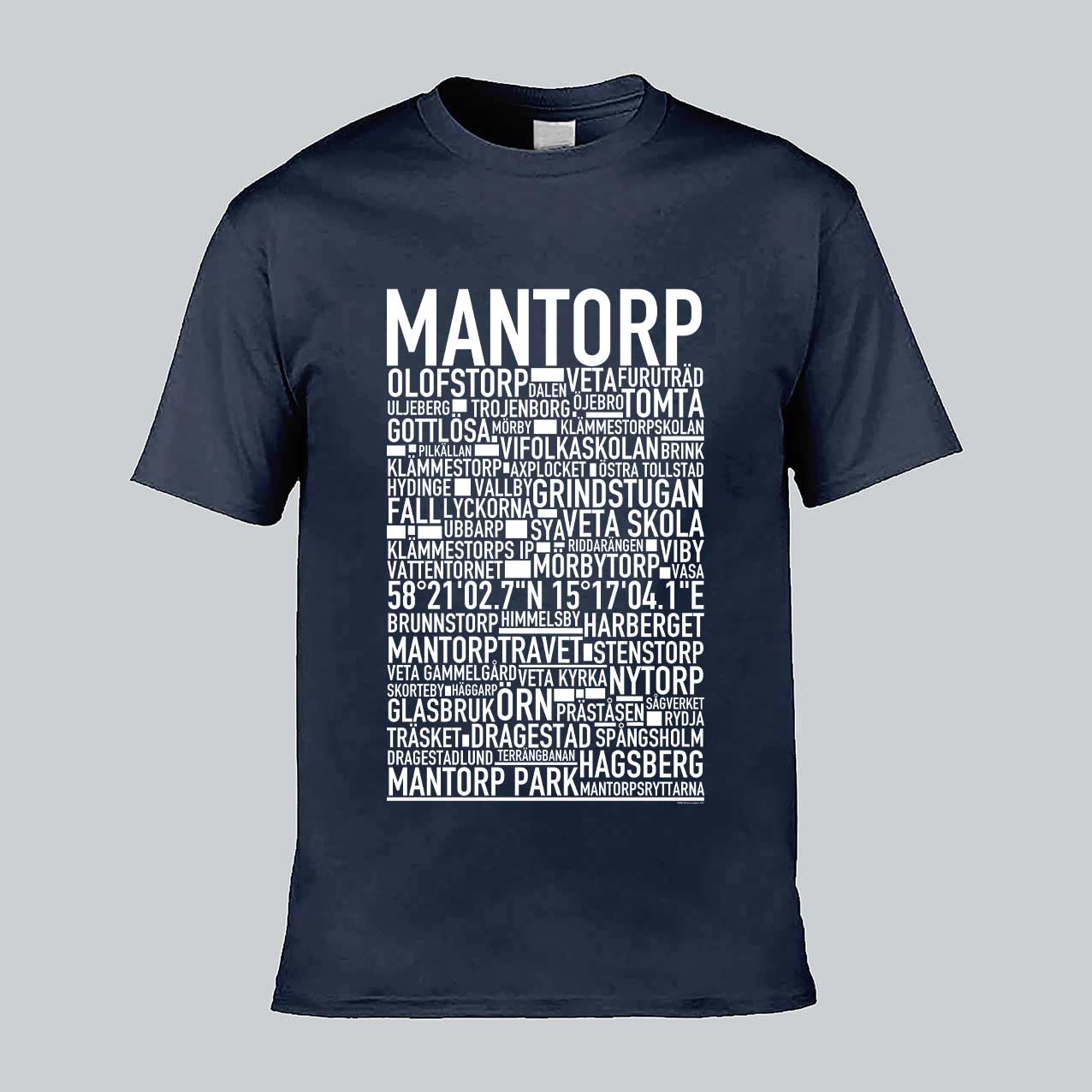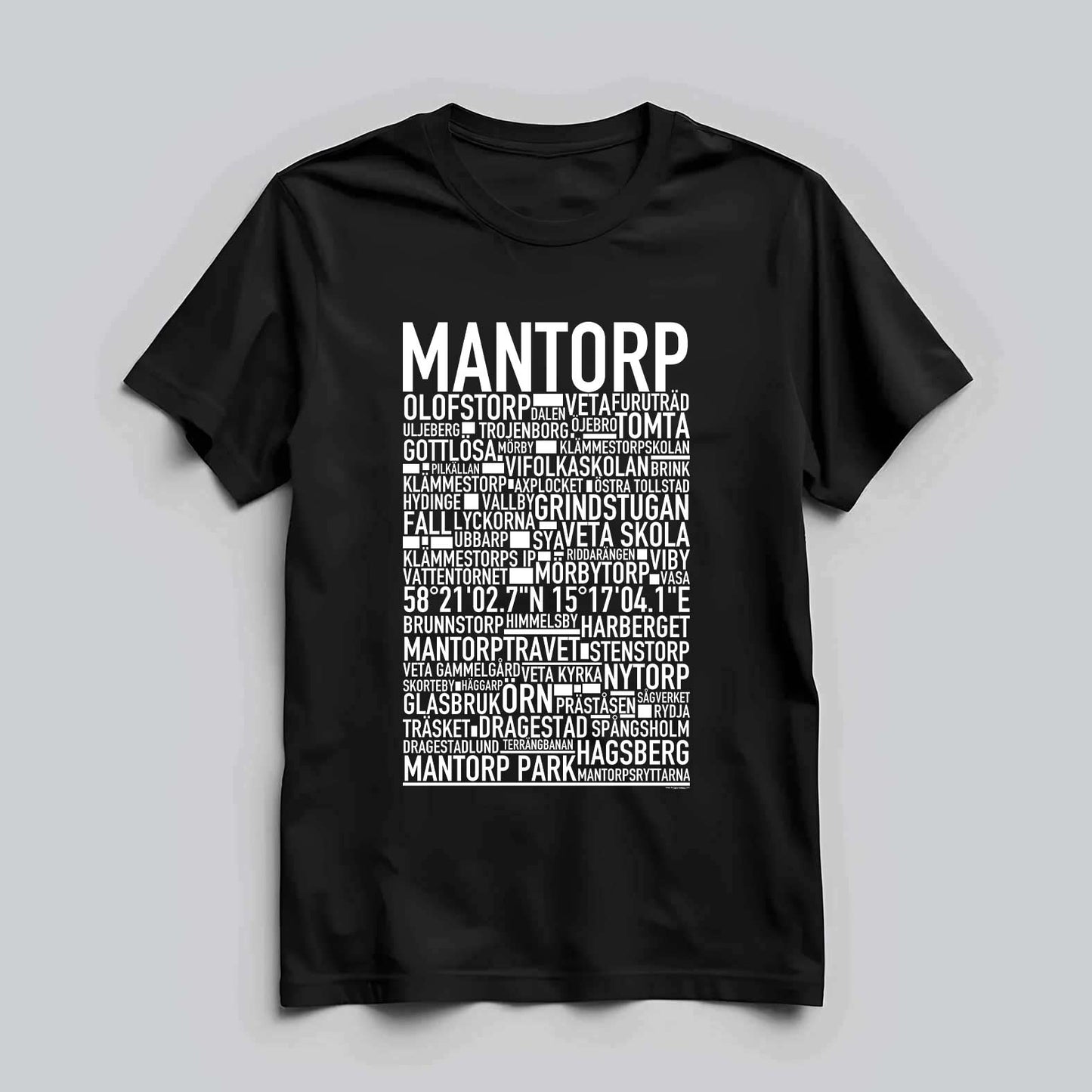 Den ikoniska T-shirten med texten "MANTORP" och namn på platser från denna östgötska ort, känd för sin travbana, motorsport och närhet till både landsbygd och stad. Denna stilrena T-shirt ger en unik touch till din garderob och låter dig stolt visa upp din kärlek till Mantorp. Tillverkad i mjuk, högkvalitativ bomull för en behaglig känsla hela dagen.