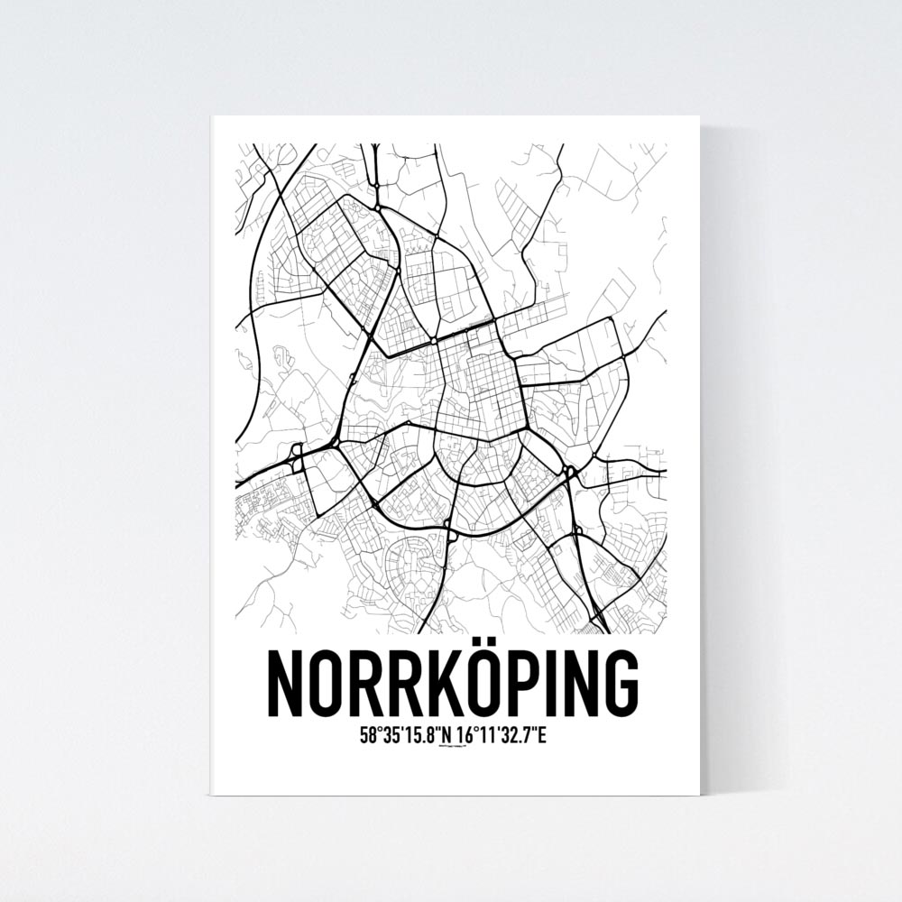 Svartvit poster med en detaljerad karta över Norrköping i en stilren design. Denna typ av karta passar perfekt i det moderna och eleganta hemmet. Postern tillverkas på beställning på högkvalitativt papper och har en vit kant som snyggt ramar in motivet.