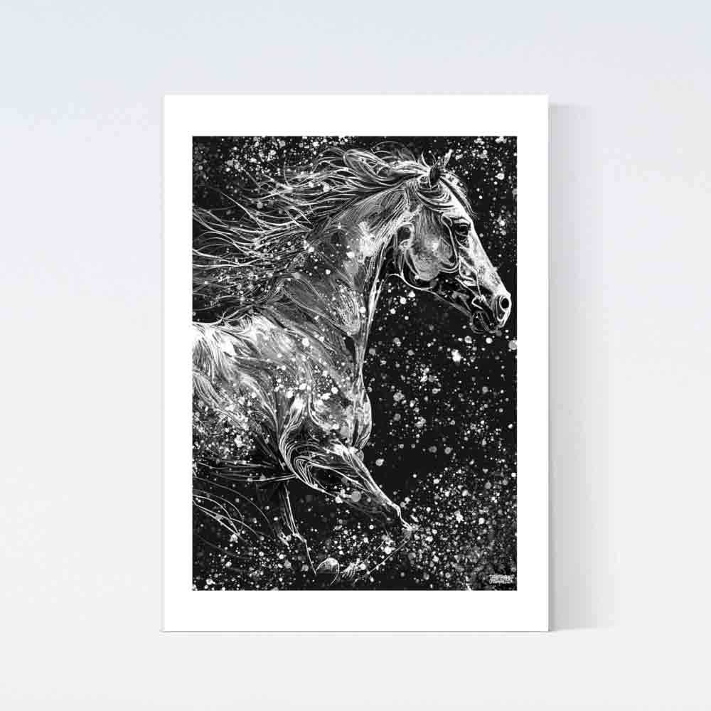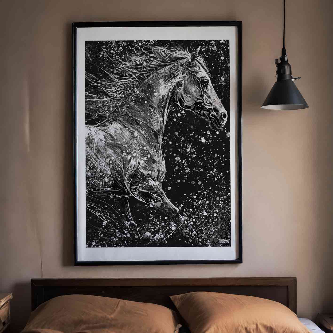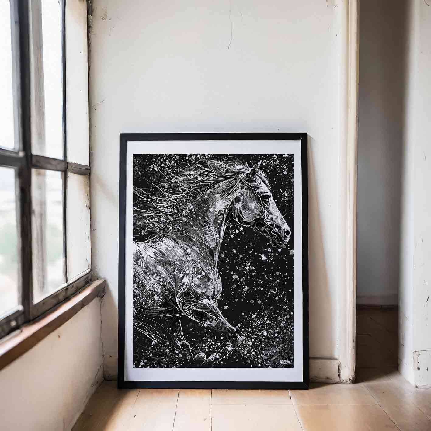 Svartvitt konstmotiv av en springande häst mot en mörk bakgrund, framtaget i samarbete med Art Damier. Ge ditt hem en elegant och tidlös touch med denna imponerande poster. Perfekt som en stilren inredningsdetalj som ger varje rum en känsla av sofistikerad glans. Postern tillverkas på beställning på högkvalitativt papper och har en vit kant som snyggt ramar in motivet.