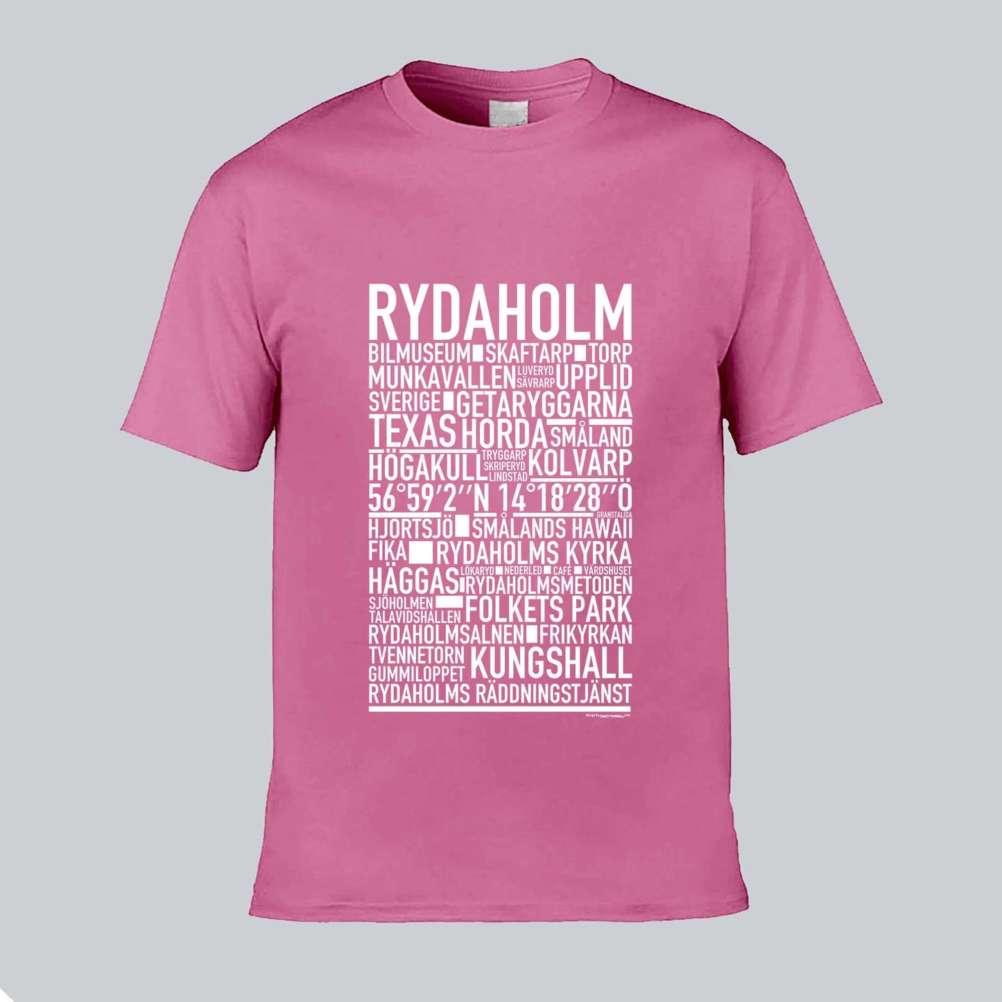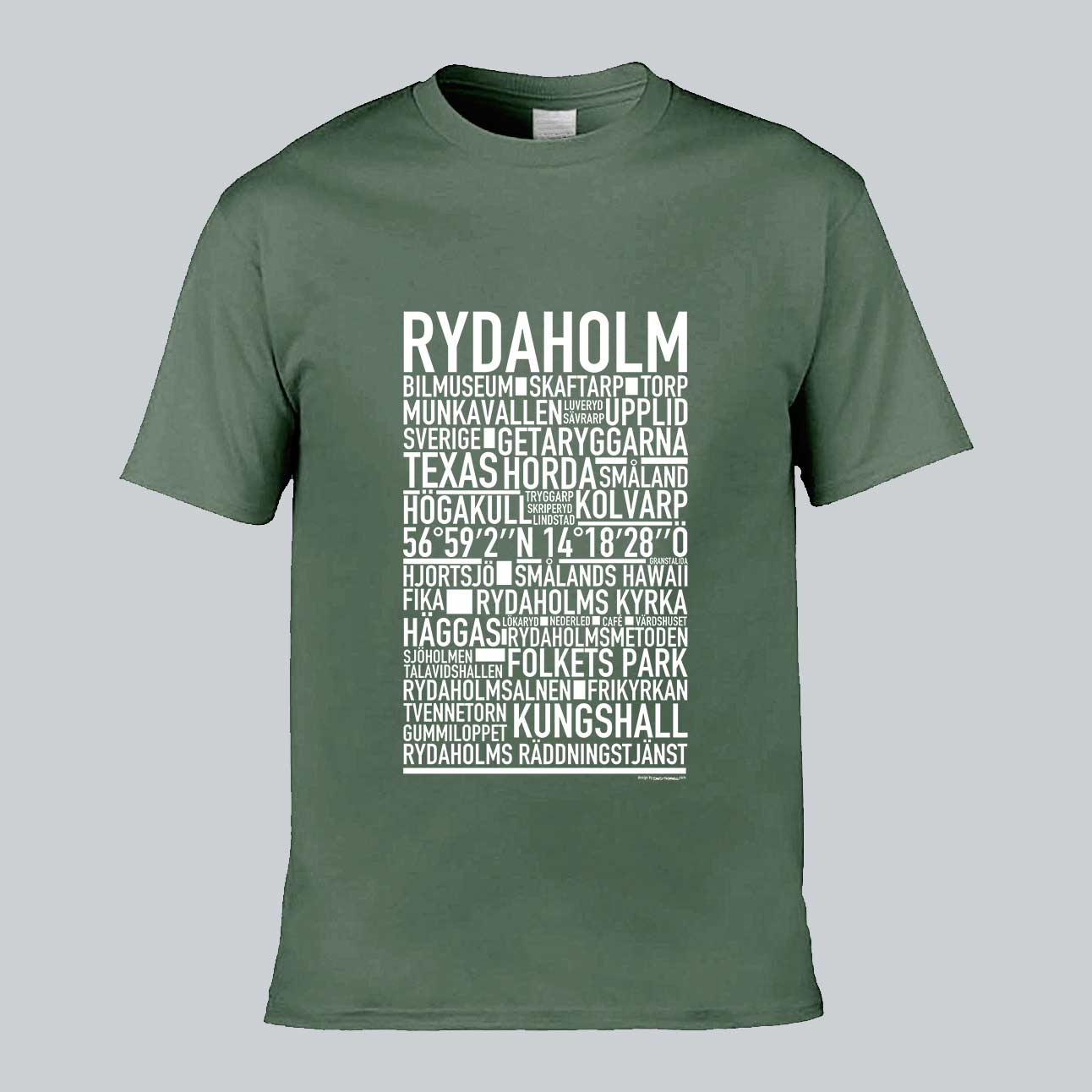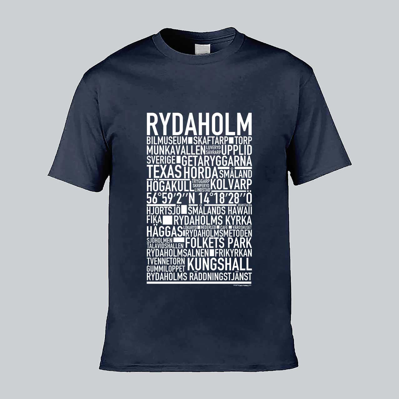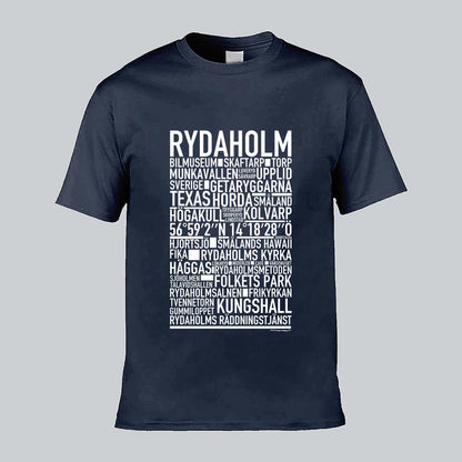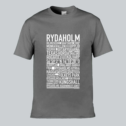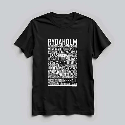 Den ikoniska T-shirten med texten "RYDAHOLM" och namn på platser från denna charmiga ort i Småland, känd för sin natursköna miljö, rika kulturarv och gemytliga småstadskänsla. Denna stilrena T-shirt ger en unik touch till din garderob och låter dig stolt visa upp din kärlek till Rydaholm. Tillverkad i mjuk, högkvalitativ bomull för en behaglig känsla hela dagen.