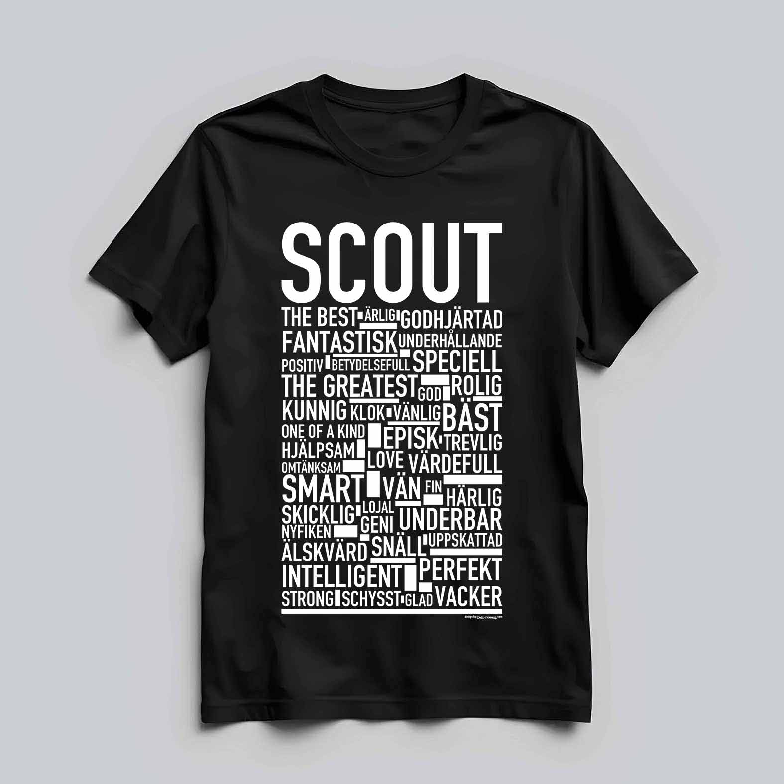 En stilren T-shirt med texten  'SCOUT'. Denna T-shirt är perfekt för att sprida en känsla av äventyr och gemenskap och är ett måste för alla scouter. Visa din passion för naturen, samarbete och personlig utveckling och bär den med stolthet, oavsett om du är på läger eller ute i vardagen. Tillverkad i mjuk, högkvalitativ bomull för en behaglig känsla hela dagen.