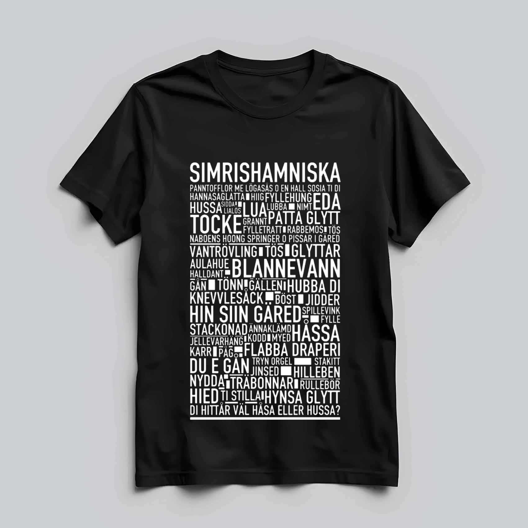 En stilfull t-shirt med texten ”SIMRISHAMNISKA”, som hyllar den lokala dialekten från Simrishamn. Perfekt för att ge din stil en personlig och lokal prägel, och för att visa stolthet över den mjuka skånska tonen, havsnära känslan och den charm som simrishamnskan bär på.