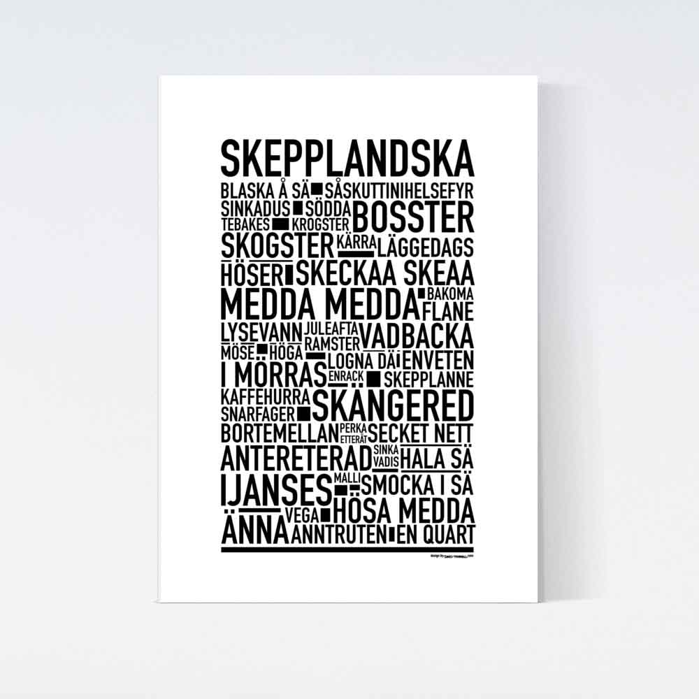 En stilren poster med texten "SKEPPLANDSKA", som hyllar den karaktäristiska och charmiga dialekten från Skepplanda. Perfekt för att ge ditt hem eller kontor en personlig och lokal touch. Postern tillverkas på beställning på högkvalitativt papper och har en vit kant som snyggt ramar in motivet.