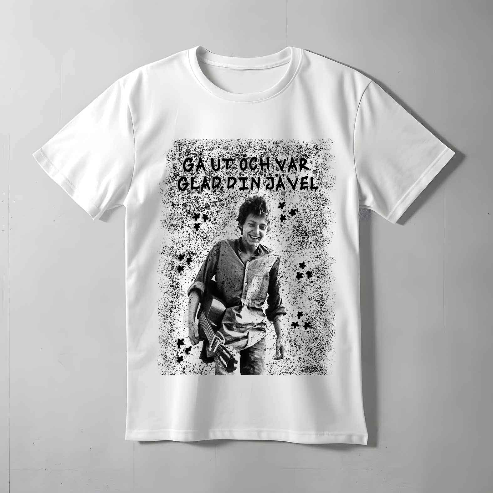 En cool T-shirt med den folkkära artisten Ulf Lundell och ett av hans berömda citat "Gå ut och var glad din jävel". Perfekt för alla fans som vill hylla sin favorit artist. Tillverkad i mjuk och skön bomull för en bekväm och stilfull look.