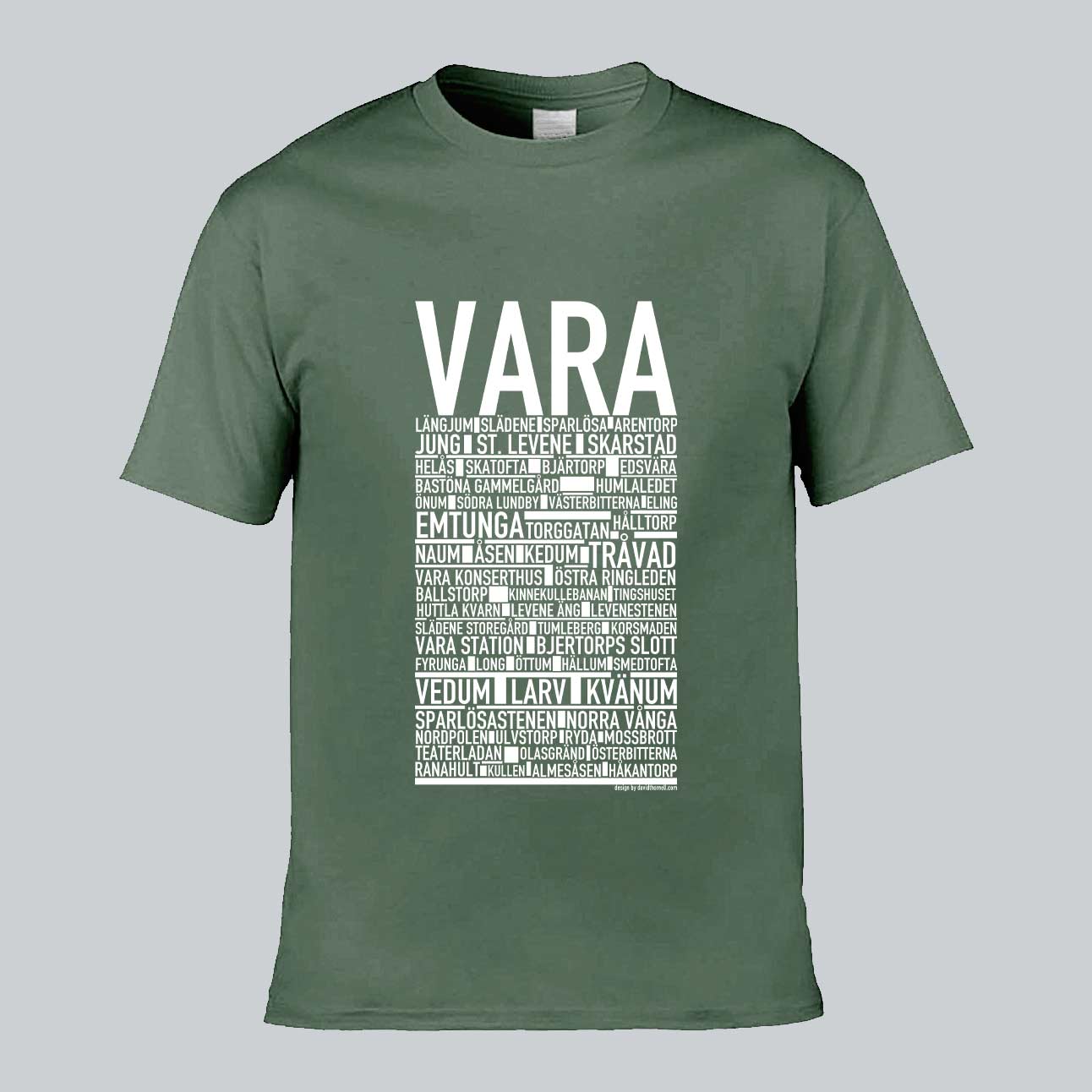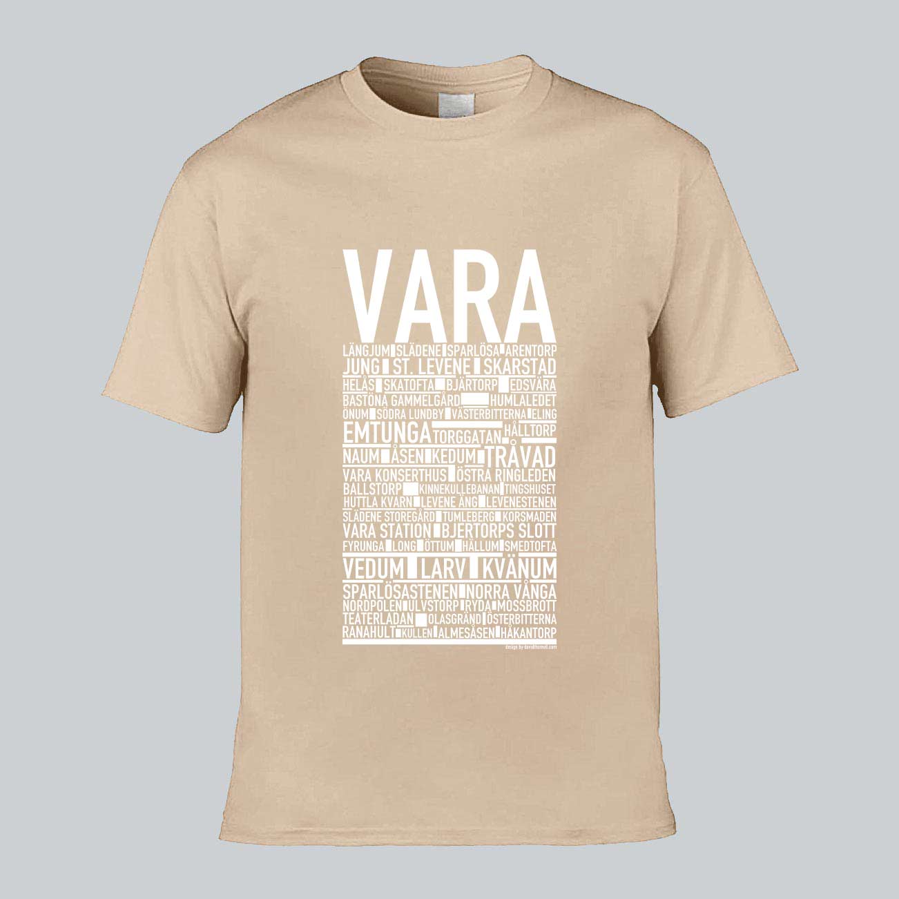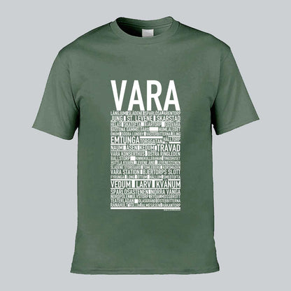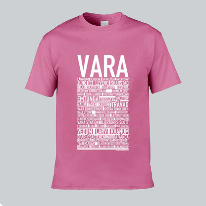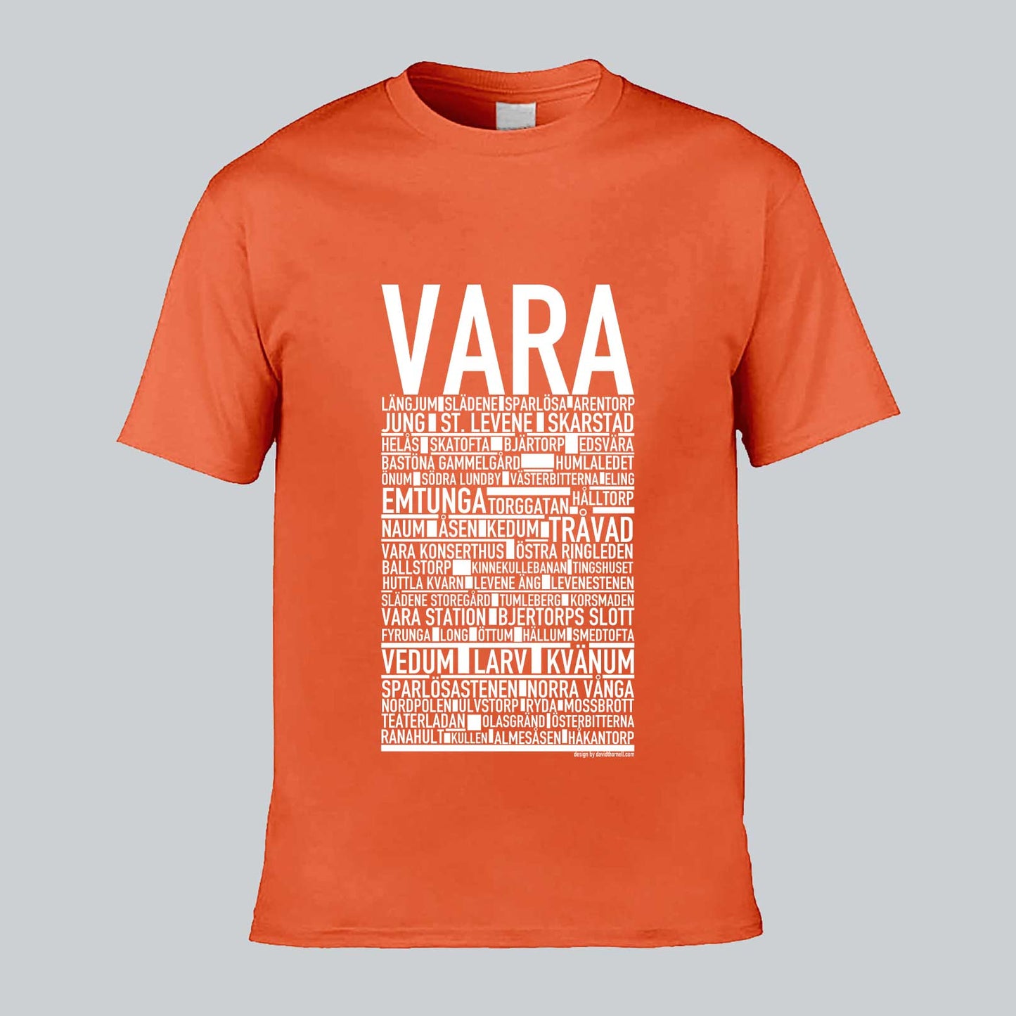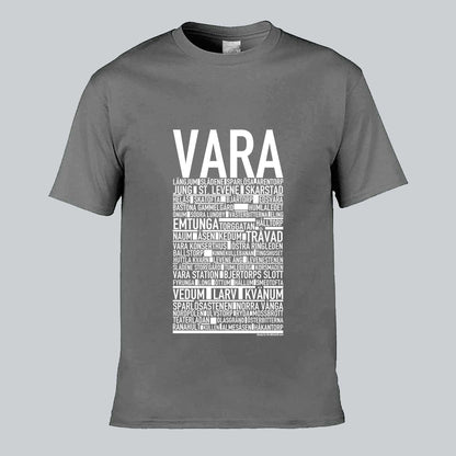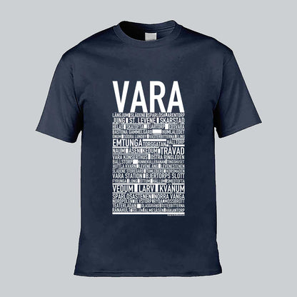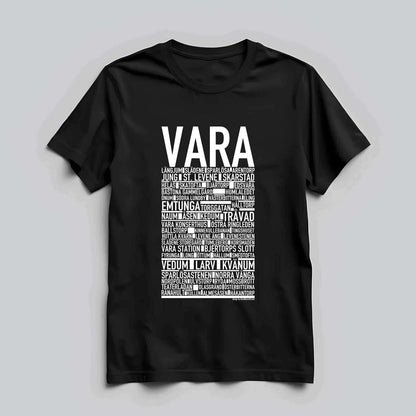 Den ikoniska T-shirten med texten "VARA" och namn på platser från denna västgötska ort, känd för sin rika kulturhistoria, vackra landskap och levande småstadsliv. Denna stilrena T-shirt ger en unik touch till din garderob och låter dig stolt visa upp din kärlek till Vara. Tillverkad i mjuk, högkvalitativ bomull för en behaglig känsla hela dagen.
