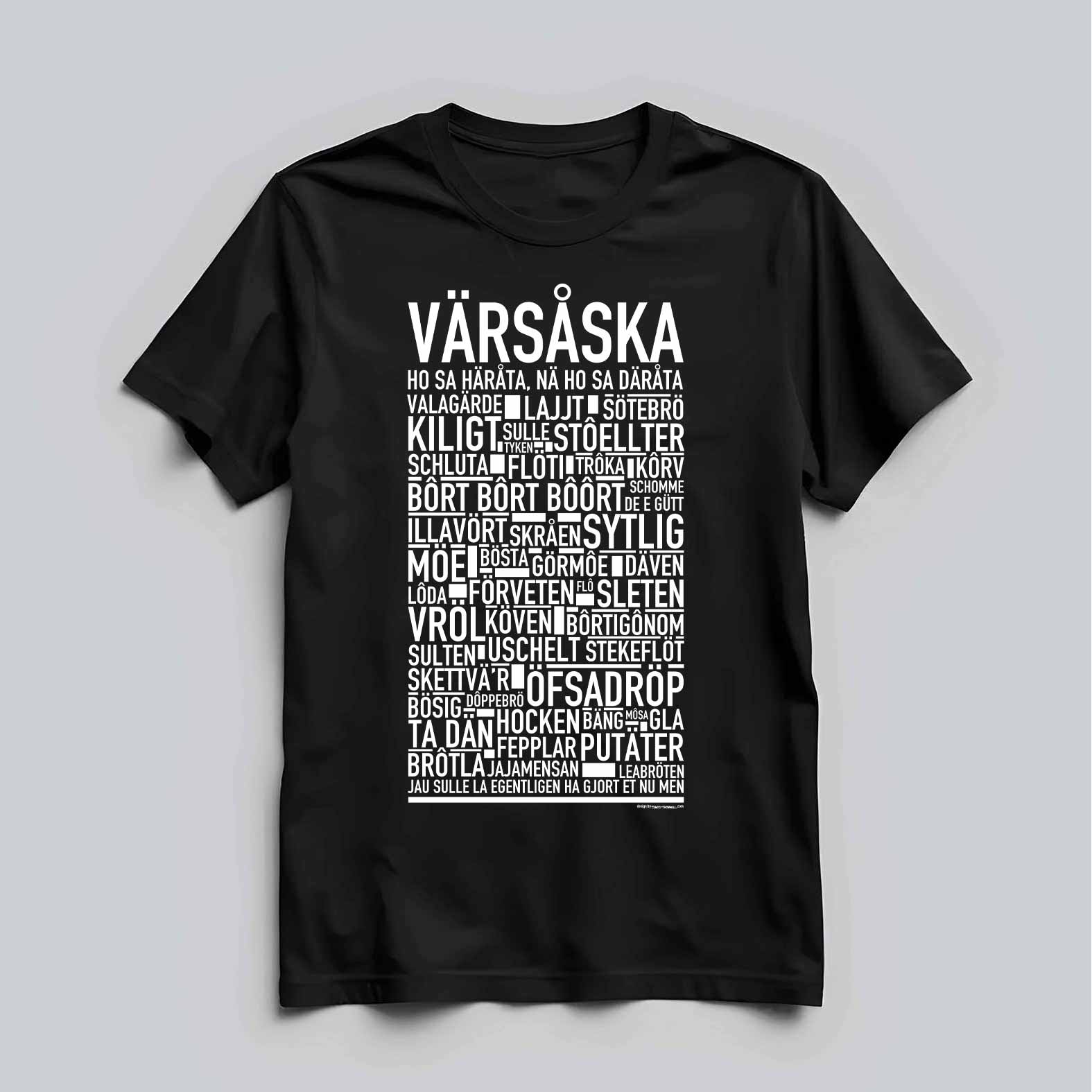 En stilren t-shirt med dialekten "VÄRSÅSKA", som hyllar den karaktäristiska och charmiga dialekten från Värsås. Perfekt för att ge din outfit en personlig och lokal touch. Tillverkad i mjuk, högkvalitativ bomull för en bekväm känsla hela dagen.