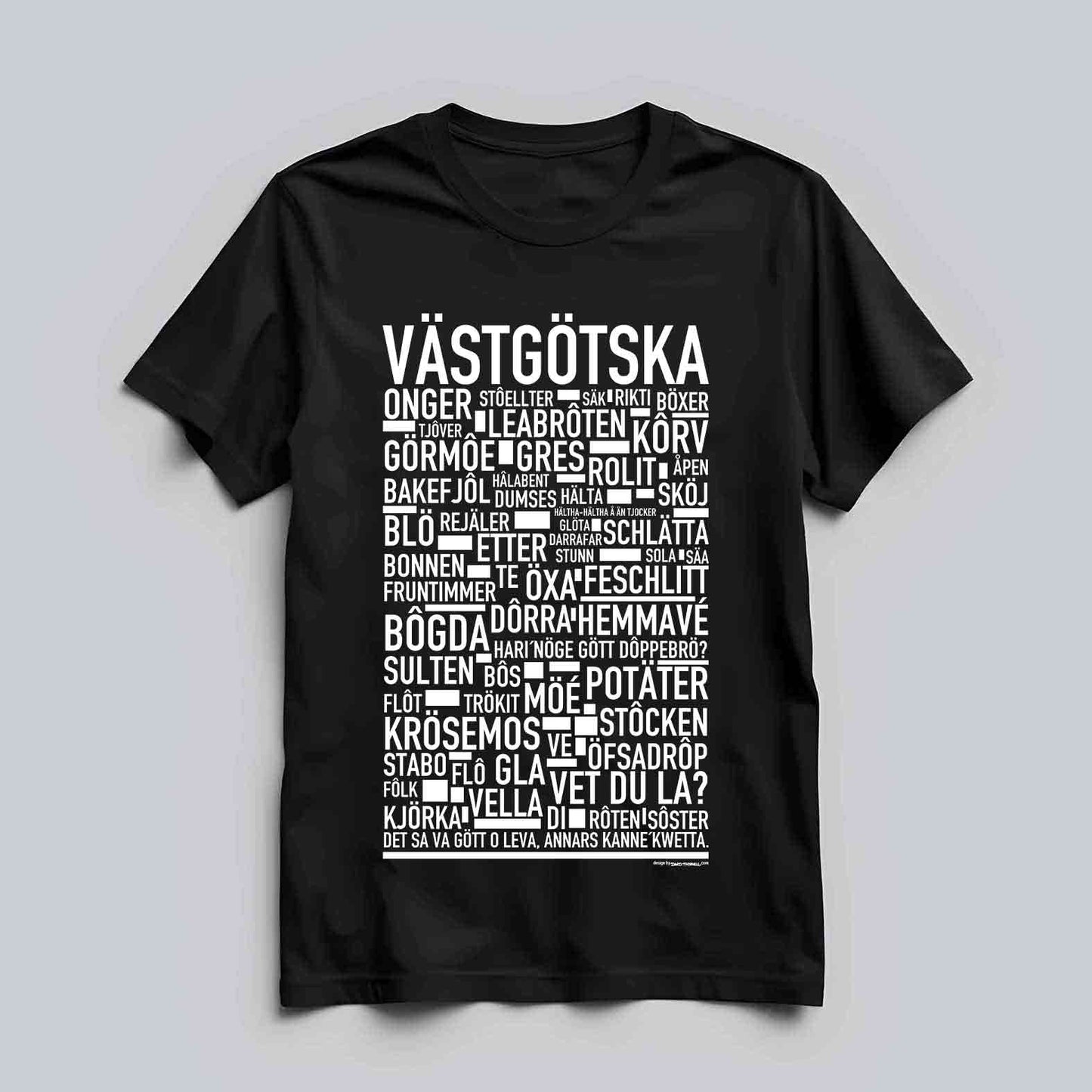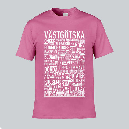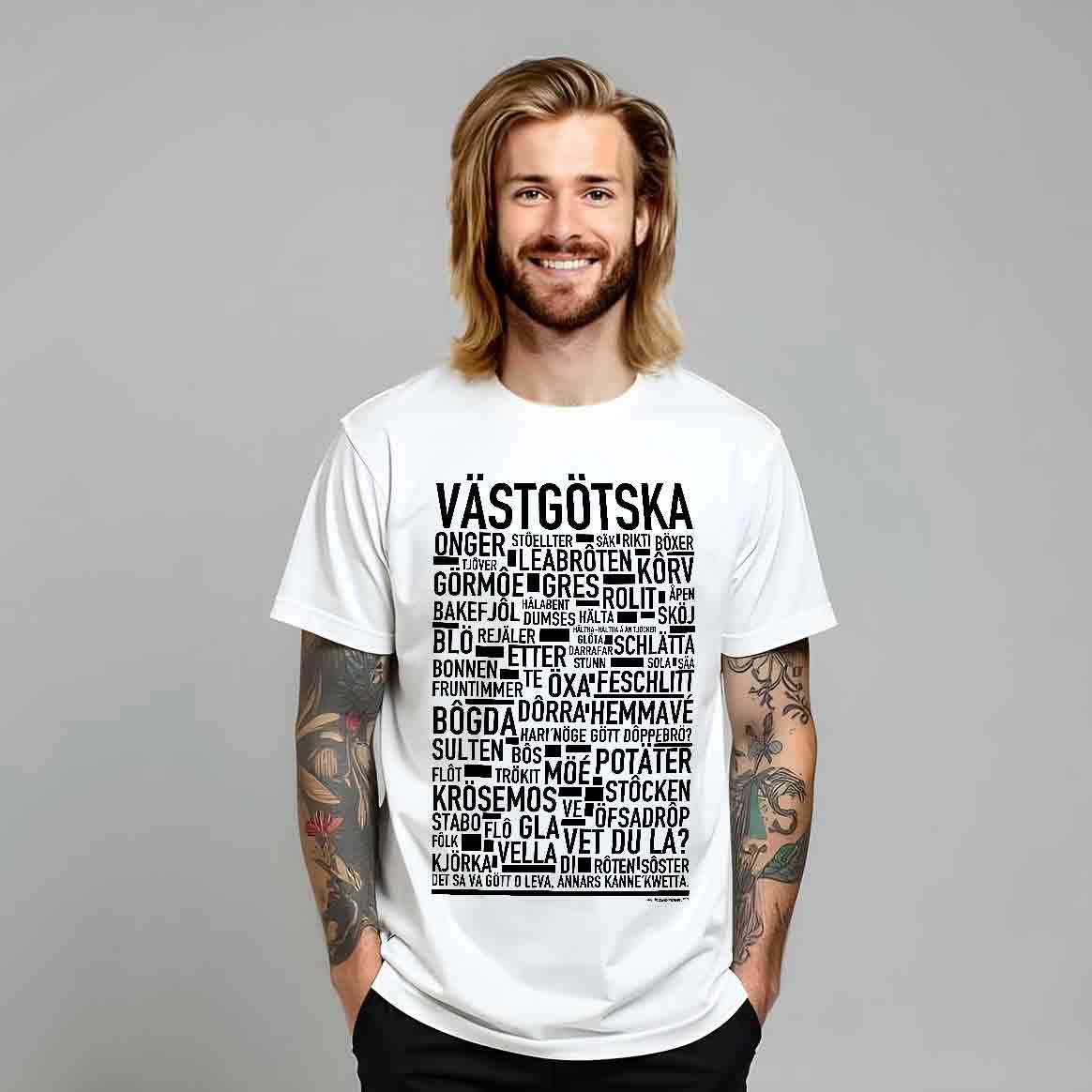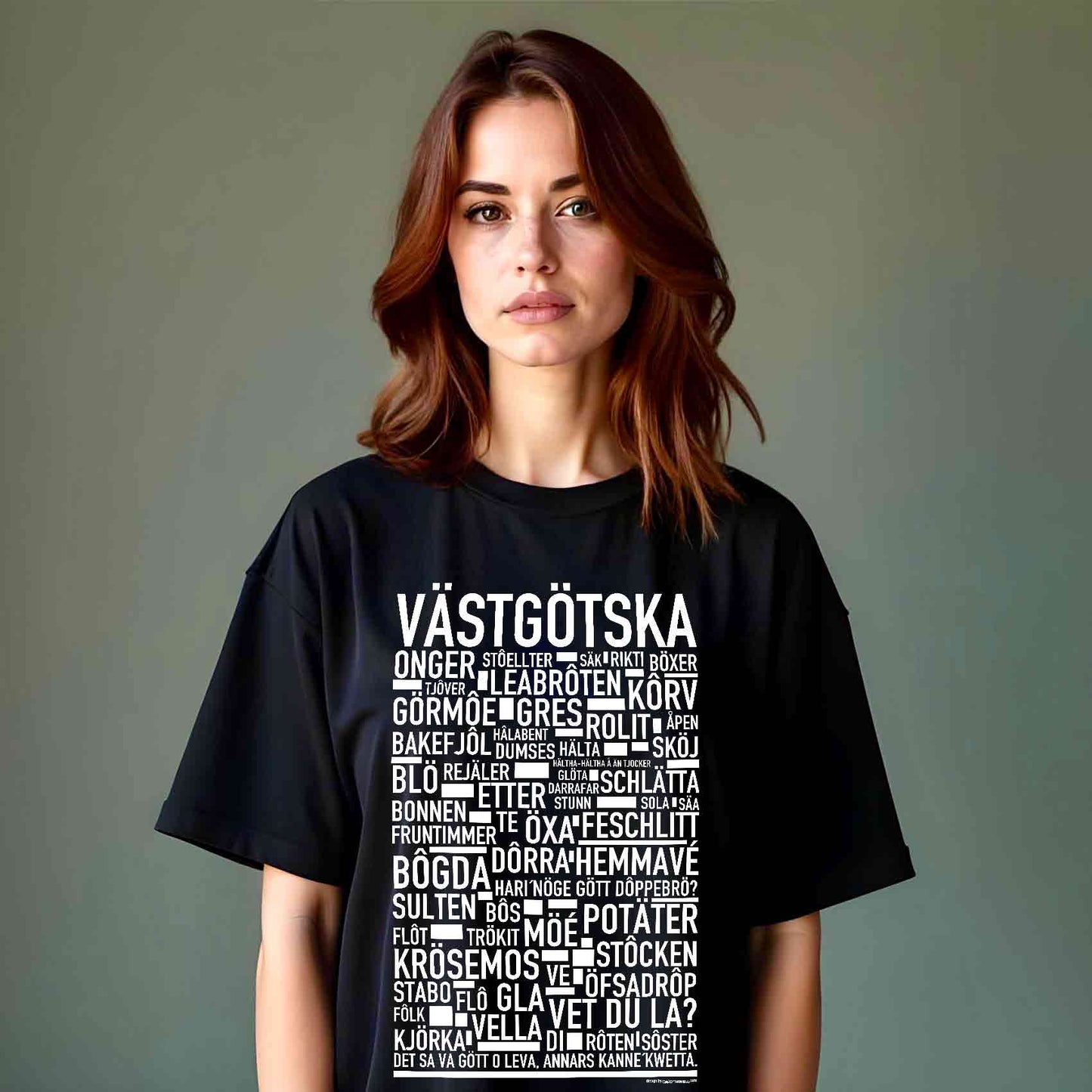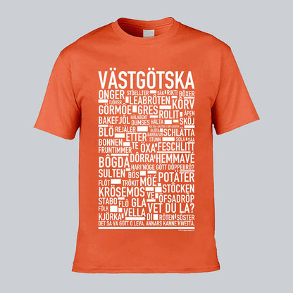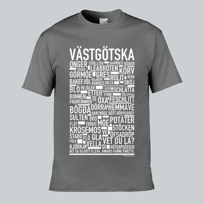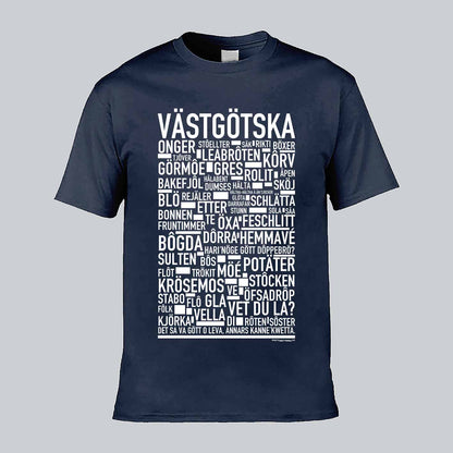 En T-shirt med dialekten 'VÄSTGÖTSKA' i stilren text – det perfekta plagget för dig som vill visa din kärlek till Västra Götaland med stolthet! Tillverkad i mjuk, högkvalitativ bomull för en bekväm känsla hela dagen. Oavsett om du är ute på äventyr eller bara vill bära en cool och bekväm T-shirt, är detta ett måste för alla som känner sig mest hemma i Västra Götalands underbar landskap.
