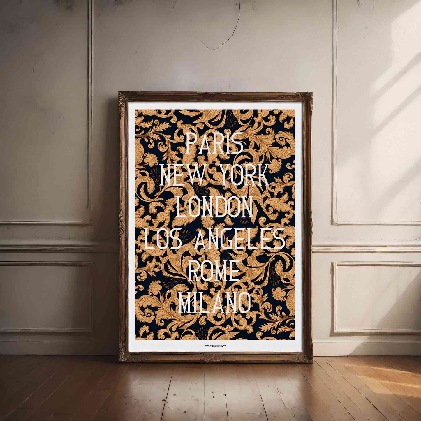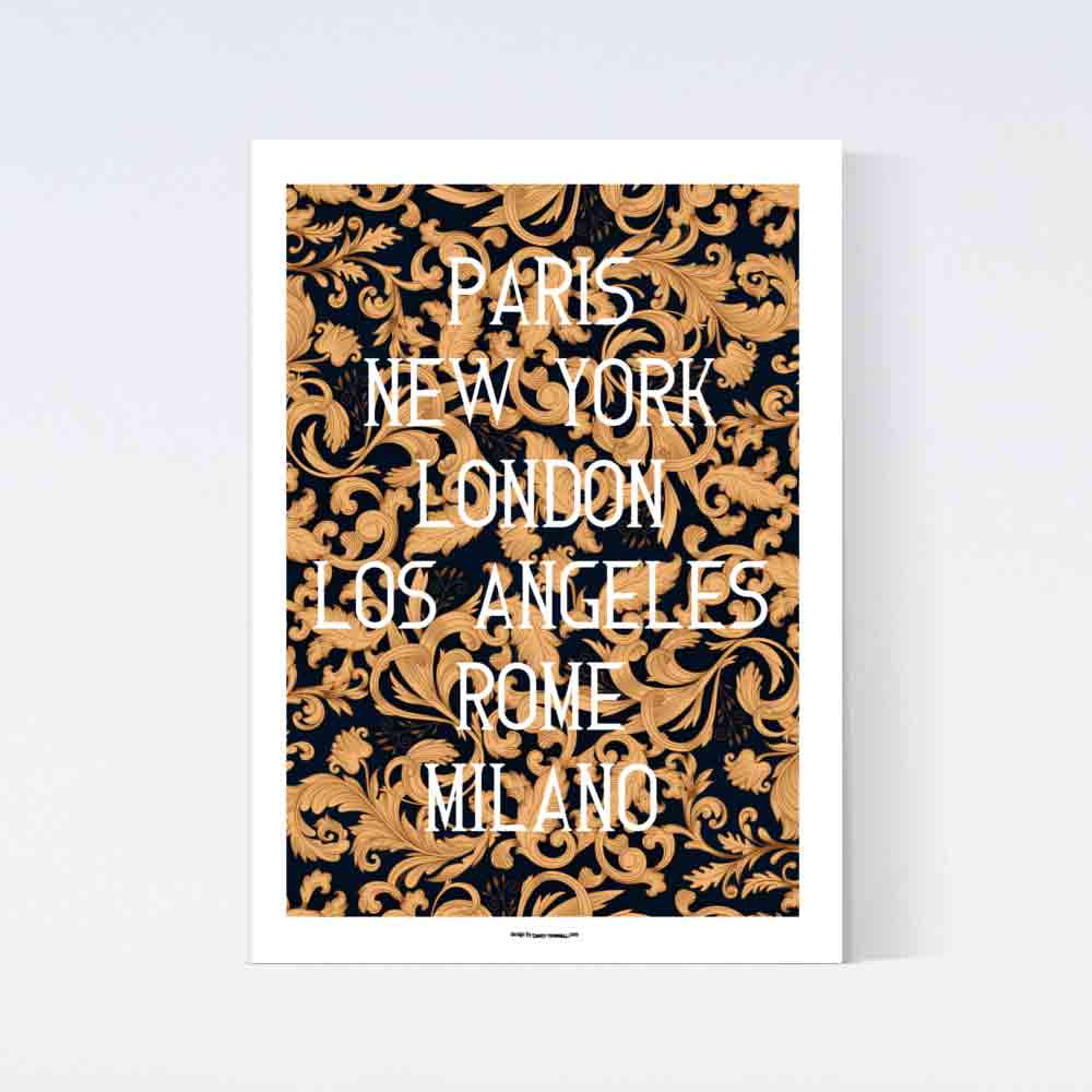 En stilfull poster med ett snyggt barockmönster och namnen på världens största modestäder. Denna design förenar den eleganta, detaljerade barockstilen med den globala modevärldens mest inflytelserika städer, vilket skapar en unik och sofistikerad inredningsdetalj för modeentusiaster. Postern tillverkas på beställning på högkvalitativt papper och har en vit kant som snyggt ramar in motivet.